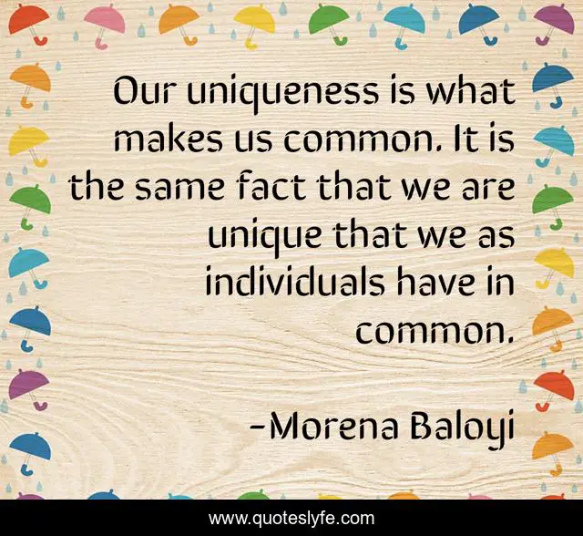This page presents the quote "Our uniqueness is what makes us common. It is the same fact that we are unique that we as individuals have in common.". Author of this quote is Morena Baloyi. This quote is about philosophy, human,.