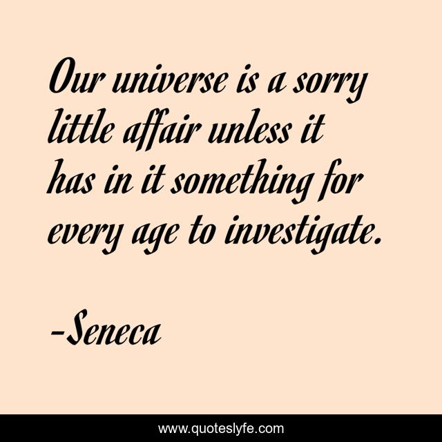This page presents the quote "Our universe is a sorry little affair unless it has in it something for every age to investigate.". Author of this quote is Seneca. This quote is about scientific-discovery, space, science, universe, space-and-cosmos, cosmos, space-exploration,.