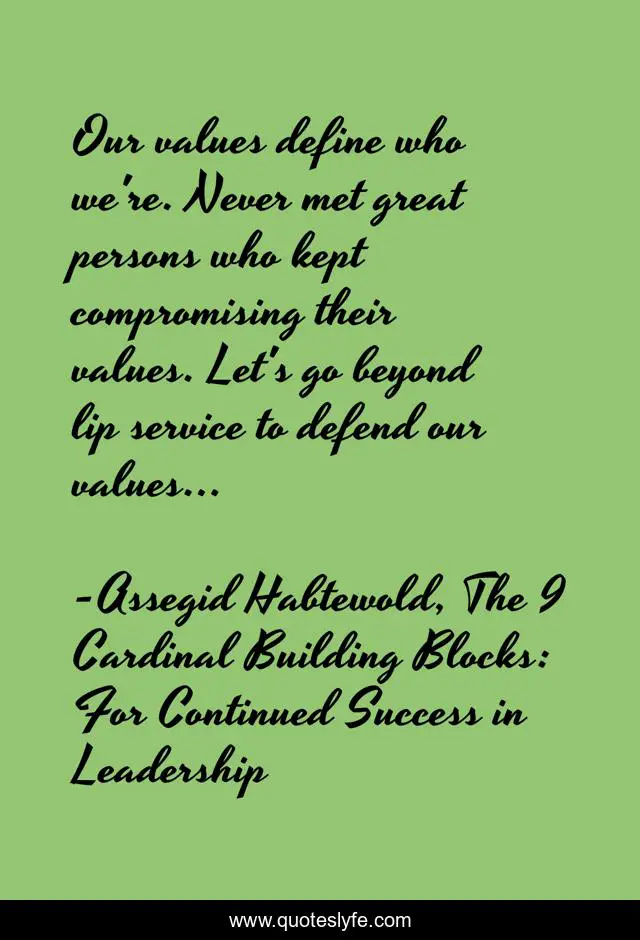 This page presents the quote "Our values define who we're. Never met great persons who kept compromising their values. Let's go beyond lip service to defend our values...". Author of this quote is Assegid Habtewold, The 9 Cardinal Building Blocks: For Continued Success in Leadership. This quote is about pro-leadership, lip-service, success-pathways, values, assegid-habtewold,.