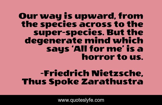 This page presents the quote "Our way is upward, from the species across to the super-species. But the degenerate mind which says ‘All for me’ is a horror to us.". Author of this quote is Friedrich Nietzsche, Thus Spoke Zarathustra. This quote is about ubermensch, prophecy, philosophy, eternal-recurrence, soul,.