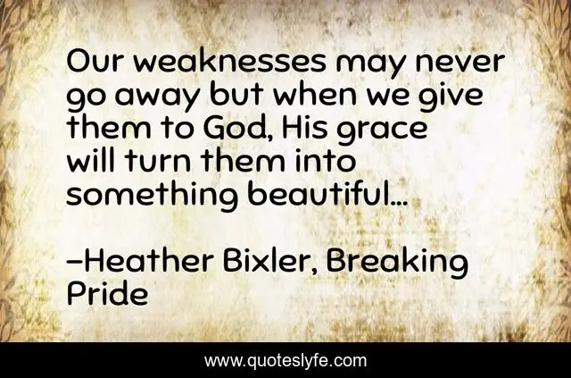 This page presents the quote "Our weaknesses may never go away but when we give them to God, His grace will turn them into something beautiful...". Author of this quote is Heather Bixler, Breaking Pride. This quote is about grace-of-god, pride, christian, grace, inspirational-religious,.