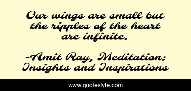 This page presents the quote "Our wings are small but the ripples of the heart are infinite.". Author of this quote is Amit Ray, Meditation: Insights and Inspirations. This quote is about compassion-love, heart, kind, kind-heart, infinity, kindness-compassion, compassion, heartfelt, ripples,.
