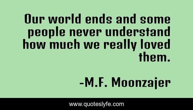 This page presents the quote "Our world ends and some people never understand how much we really loved them.". Author of this quote is M.F. Moonzajer. This quote is about end-of-world, forget, understand, love, real-love, affection,.