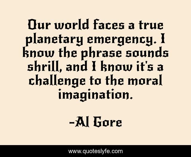 This page presents the quote "Our world faces a true planetary emergency. I know the phrase sounds shrill, and I know it's a challenge to the moral imagination.". Author of this quote is Al Gore. This quote is about environmental, challenge,.