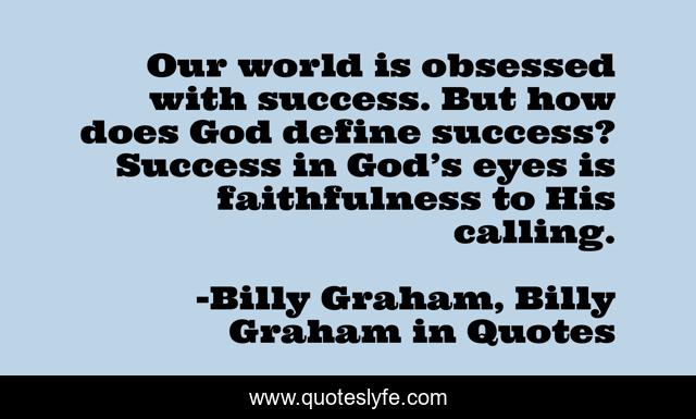This page presents the quote "Our world is obsessed with success. But how does God define success? Success in God’s eyes is faithfulness to His calling.". Author of this quote is Billy Graham, Billy Graham in Quotes. This quote is about success, billy-graham,.