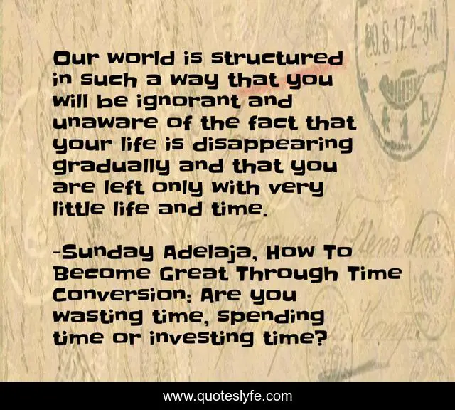 This page presents the quote "Our world is structured in such a way that you will be ignorant and unaware of the fact that your life is disappearing gradually and that you are left only with very little life and time.". Author of this quote is Sunday Adelaja, How To Become Great Through Time Conversion: Are you wasting time, spending time or investing time?. This quote is about life, conversion, productivity, wealth, way, greatness, waste, structures, humanity,.