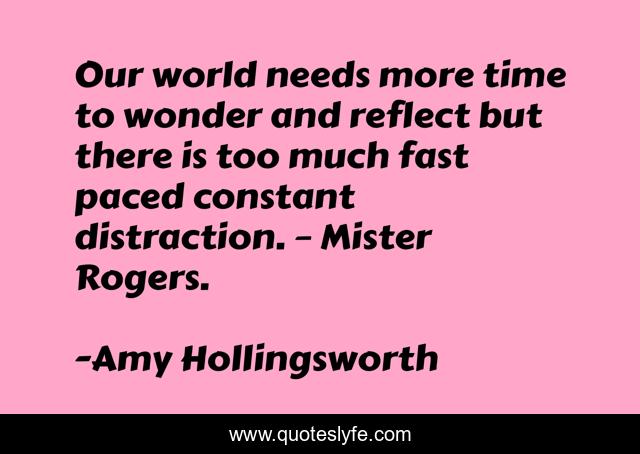 This page presents the quote "Our world needs more time to wonder and reflect but there is too much fast paced constant distraction. – Mister Rogers.". Author of this quote is Amy Hollingsworth. .