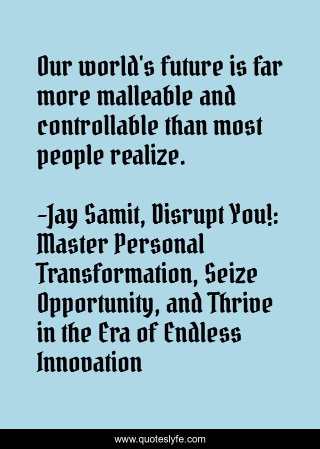 "Jay Samit, Disrupt You!: Master Personal Transformation, Seize Opportunity, and Thrive in the Era of Endless Innovation Quotes." Quoteslyfe.com, 2026. Tue. 13 Jan. 2026. <https://www.quoteslyfe.com/quote/Our-world-s-future-is-far-more-106483>.