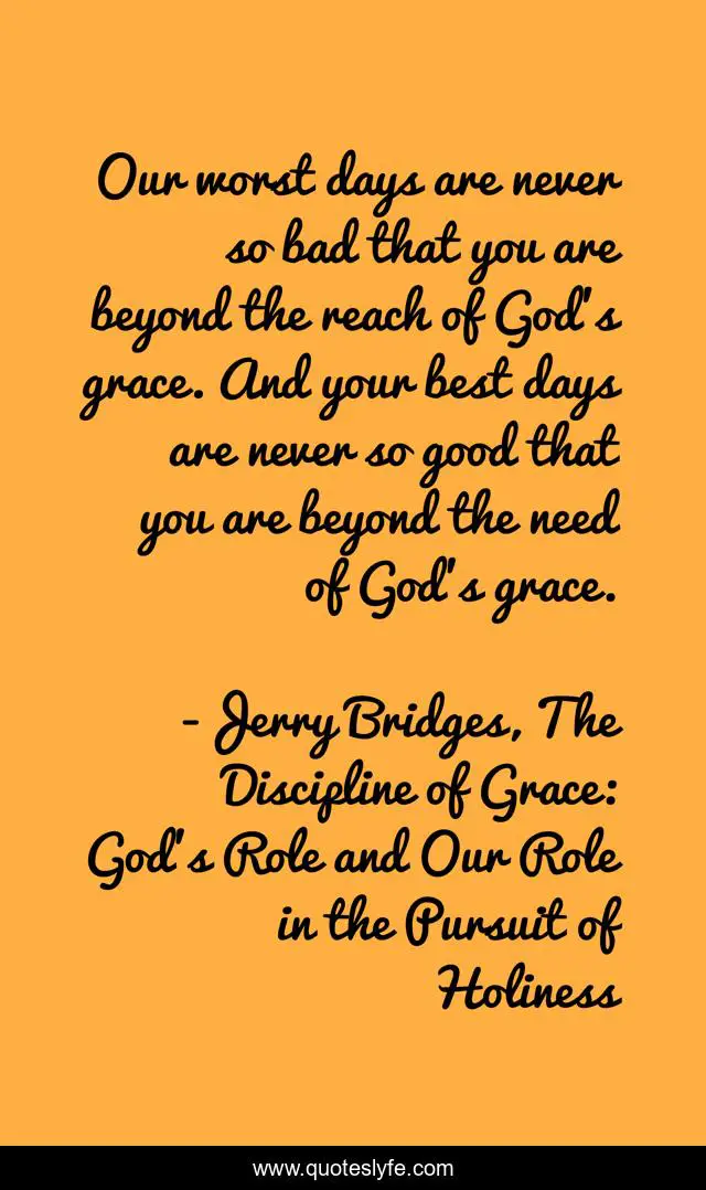 This page presents the quote "Our worst days are never so bad that you are beyond the reach of God's grace. And your best days are never so good that you are beyond the need of God's grace.". Author of this quote is Jerry Bridges, The Discipline of Grace: God's Role and Our Role in the Pursuit of Holiness. This quote is about good-days, bad-days, christ, grace,.