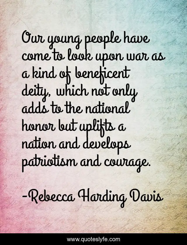 This page presents the quote "Our young people have come to look upon war as a kind of beneficent deity, which not only adds to the national honor but uplifts a nation and develops patriotism and courage.". Author of this quote is Rebecca Harding Davis. This quote is about patriotism, war, honor,.