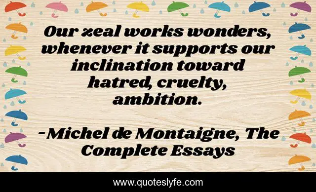 This page presents the quote "Our zeal works wonders, whenever it supports our inclination toward hatred, cruelty, ambition.". Author of this quote is Michel de Montaigne, The Complete Essays. .