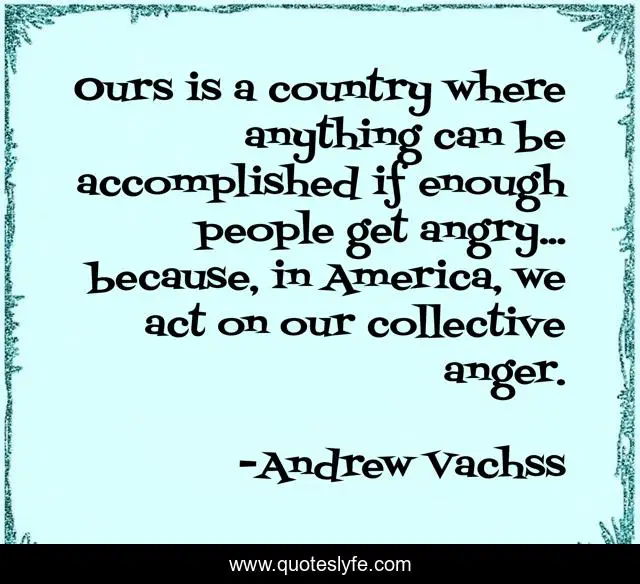 This page presents the quote "Ours is a country where anything can be accomplished if enough people get angry... because, in America, we act on our collective anger.". Author of this quote is Andrew Vachss. This quote is about angry, america, people,.