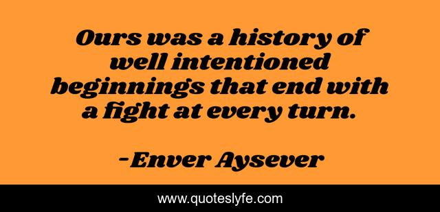 This page presents the quote "Ours was a history of well intentioned beginnings that end with a fight at every turn.". Author of this quote is Enver Aysever. This quote is about breaking-up, relationships, love, affection, fight,.