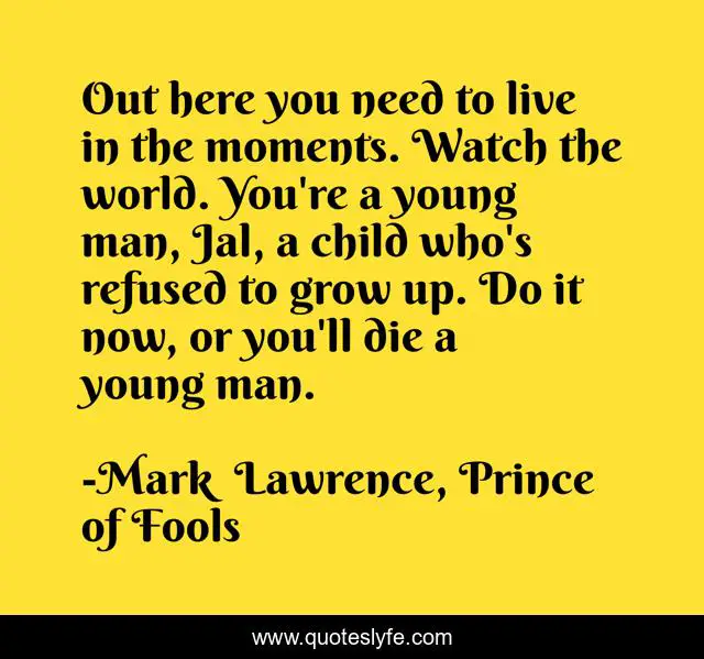 This page presents the quote "Out here you need to live in the moments. Watch the world. You're a young man, Jal, a child who's refused to grow up. Do it now, or you'll die a young man.". Author of this quote is Mark Lawrence, Prince of Fools. This quote is about grow-up, moments, young, live, child, world,.