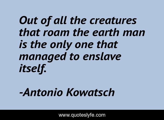This page presents the quote "Out of all the creatures that roam the earth man is the only one that managed to enslave itself.". Author of this quote is Antonio Kowatsch. This quote is about freedom, life, mind, wisdom,.