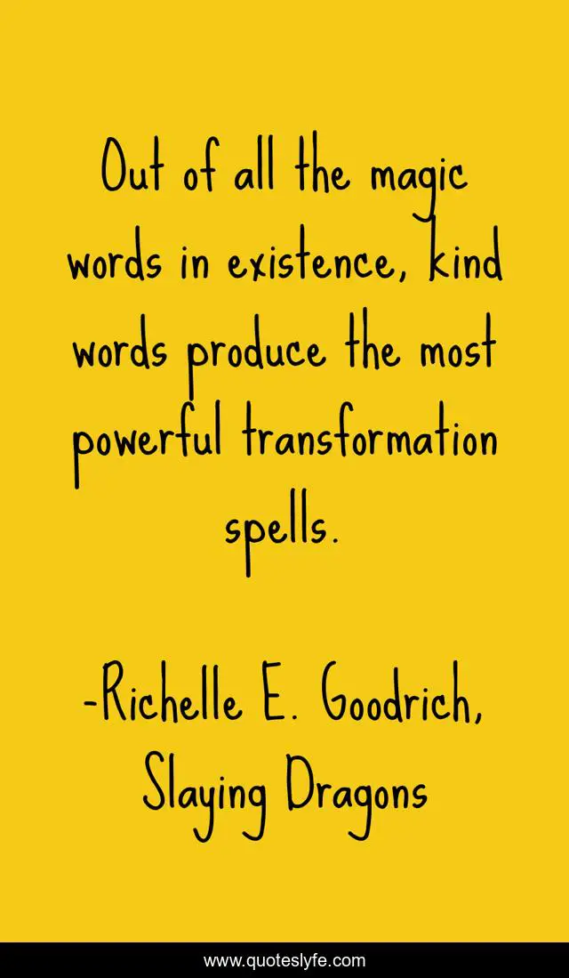 This page presents the quote "Out of all the magic words in existence, kind words produce the most powerful transformation spells.". Author of this quote is Richelle E. Goodrich, Slaying Dragons. This quote is about kind, magic-words, richelle-e-goodrich, kind-words, be-kind, richelle, richelle-goodrich, kindness,.