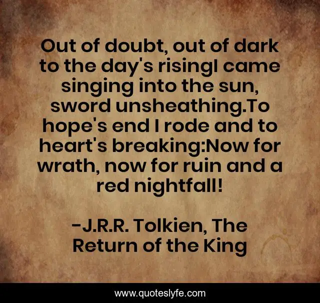 This page presents the quote "Out of doubt, out of dark to the day's risingI came singing into the sun, sword unsheathing.To hope's end I rode and to heart's breaking:Now for wrath, now for ruin and a red nightfall!". Author of this quote is J.R.R. Tolkien, The Return of the King. .