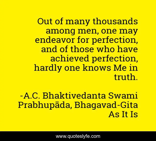 This page presents the quote "Out of many thousands among men, one may endeavor for perfection, and of those who have achieved perfection, hardly one knows Me in truth.". Author of this quote is A.C. Bhaktivedanta Swami Prabhupāda, Bhagavad-Gita As It Is. This quote is about self-realization, spirituality,.