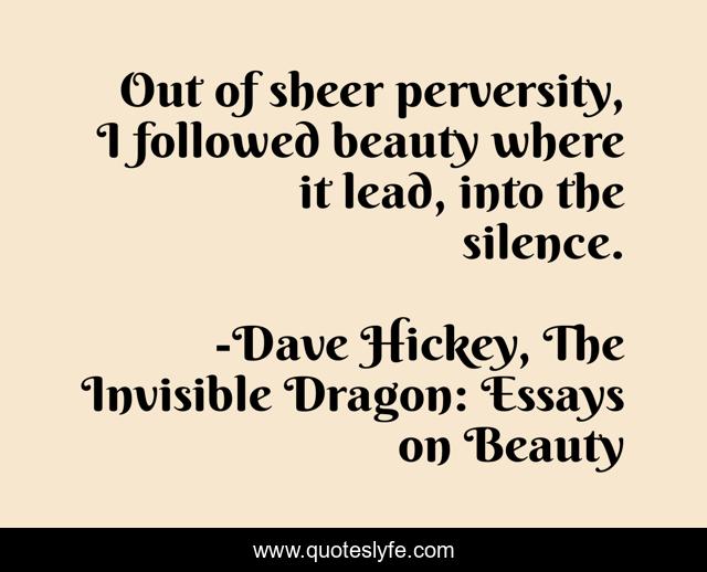 This page presents the quote "Out of sheer perversity, I followed beauty where it lead, into the silence.". Author of this quote is Dave Hickey, The Invisible Dragon: Essays on Beauty. This quote is about beauty, silence, perversity,.