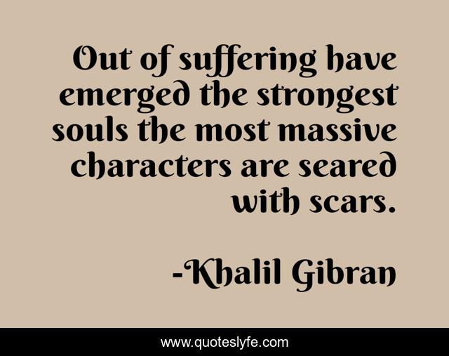 This page presents the quote "Out of suffering have emerged the strongest souls the most massive characters are seared with scars.". Author of this quote is Khalil Gibran. This quote is about suffering, scars, souls,.