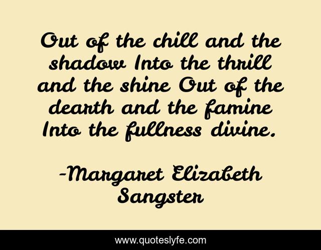This page presents the quote "Out of the chill and the shadow Into the thrill and the shine Out of the dearth and the famine Into the fullness divine.". Author of this quote is Margaret Elizabeth Sangster. This quote is about faith, unity,.