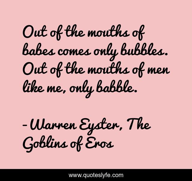 This page presents the quote "Out of the mouths of babes comes only bubbles. Out of the mouths of men like me, only babble.". Author of this quote is Warren Eyster, The Goblins of Eros. This quote is about cynicism, human-intelligence, innocence, wisdom,.