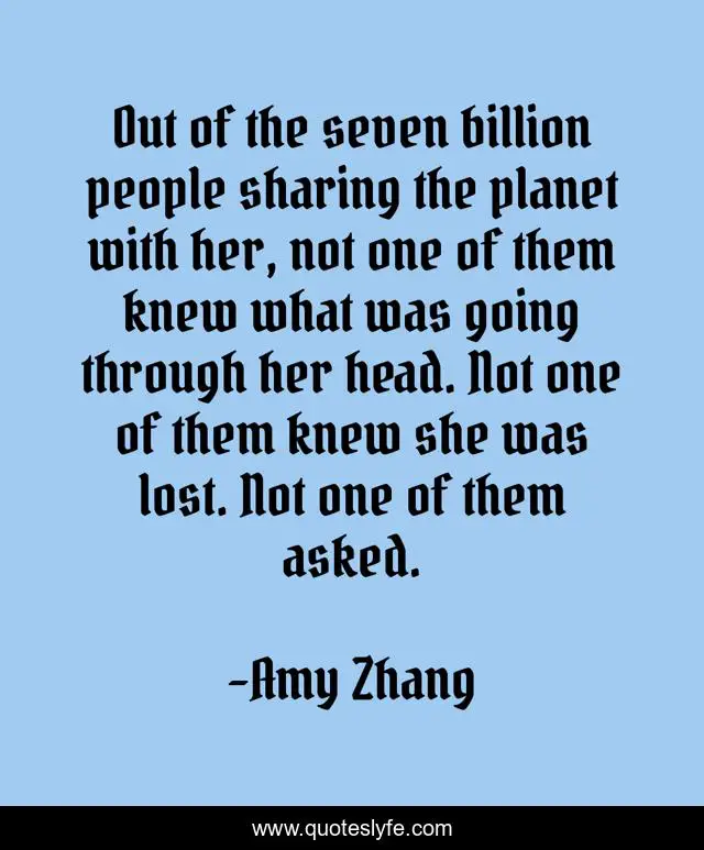 This page presents the quote "Out of the seven billion people sharing the planet with her, not one of them knew what was going through her head. Not one of them knew she was lost. Not one of them asked.". Author of this quote is Amy Zhang. This quote is about sadness, young-adult, depression,.