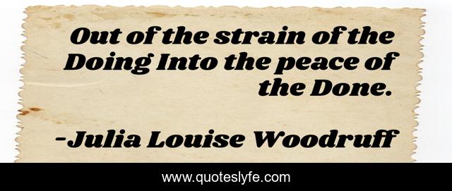 This page presents the quote "Out of the strain of the Doing Into the peace of the Done.". Author of this quote is Julia Louise Woodruff. This quote is about ability, achievement,.