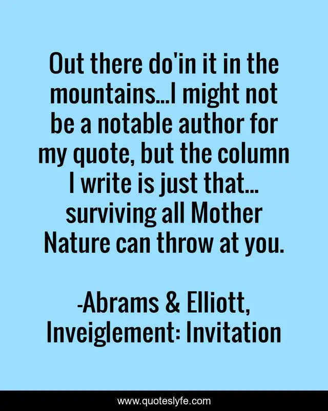 This page presents the quote "Out there do'in it in the mountains...I might not be a notable author for my quote, but the column I write is just that... surviving all Mother Nature can throw at you.". Author of this quote is Abrams & Elliott, Inveiglement: Invitation. .