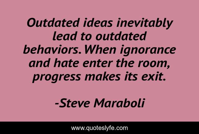 This page presents the quote "Outdated ideas inevitably lead to outdated behaviors. When ignorance and hate enter the room, progress makes its exit.". Author of this quote is Steve Maraboli. This quote is about ideas, behavior, ignorance,.