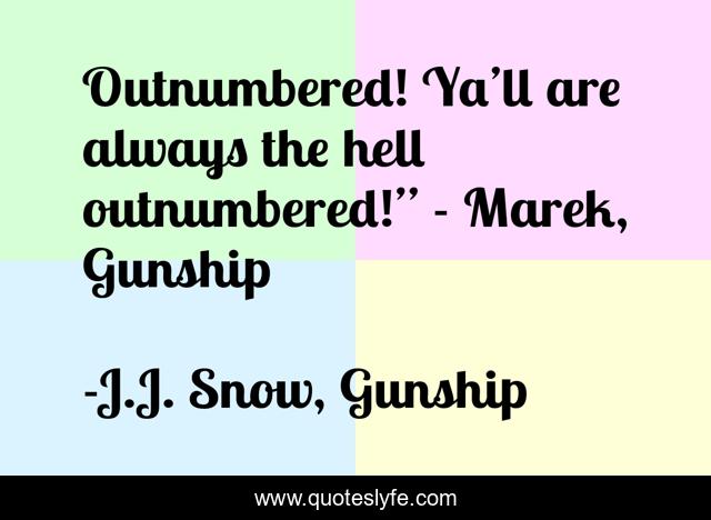 This page presents the quote "Outnumbered! Ya’ll are always the hell outnumbered!” - Marek, Gunship". Author of this quote is J.J. Snow, Gunship. This quote is about action-adventure, gunship, j-j-snow, sci-fi,.