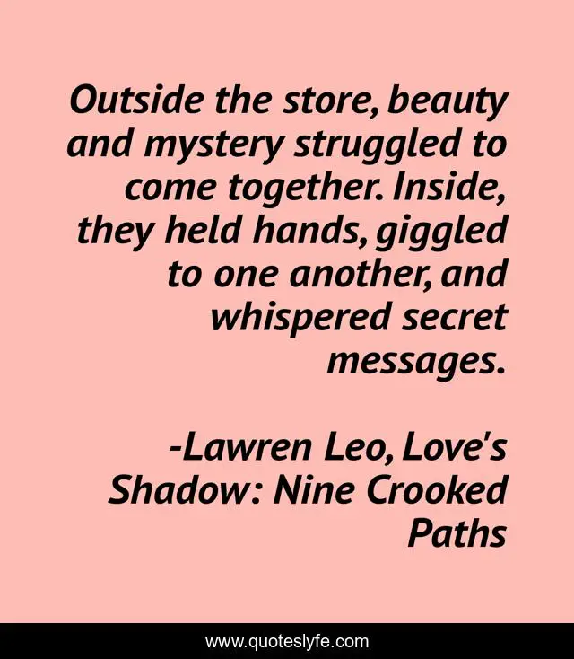 This page presents the quote "Outside the store, beauty and mystery struggled to come together. Inside, they held hands, giggled to one another, and whispered secret messages.". Author of this quote is Lawren Leo, Love's Shadow: Nine Crooked Paths. This quote is about mystery, beauty, secrets, messages, happy-messages, alchemy, happiness,.