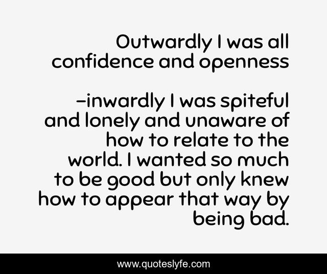 "inwardly I was spiteful and lonely and unaware of how to relate to the world. I wanted so much to be good but only knew how to appear that way by being bad. Quotes." Quoteslyfe.com, 2025. Fri. 05 Dec. 2025. <https://www.quoteslyfe.com/quote/Outwardly-I-was-all-confidence-and-openness-138875>.