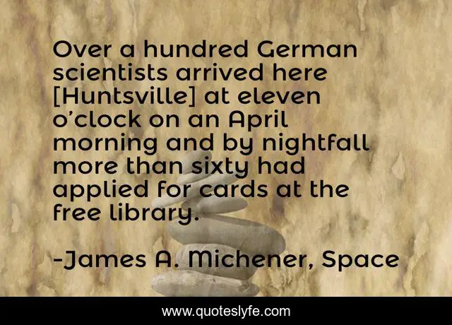 "James A. Michener, Space Quotes." Quoteslyfe.com, 2025. Fri. 05 Dec. 2025. <https://www.quoteslyfe.com/quote/Over-a-hundred-German-scientists-arrived-here-33787>.