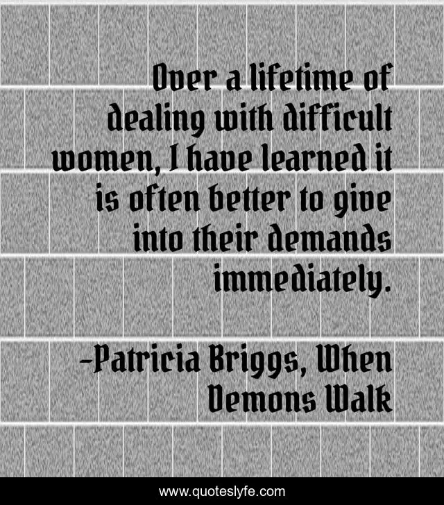 This page presents the quote "Over a lifetime of dealing with difficult women, I have learned it is often better to give into their demands immediately.". Author of this quote is Patricia Briggs, When Demons Walk. .