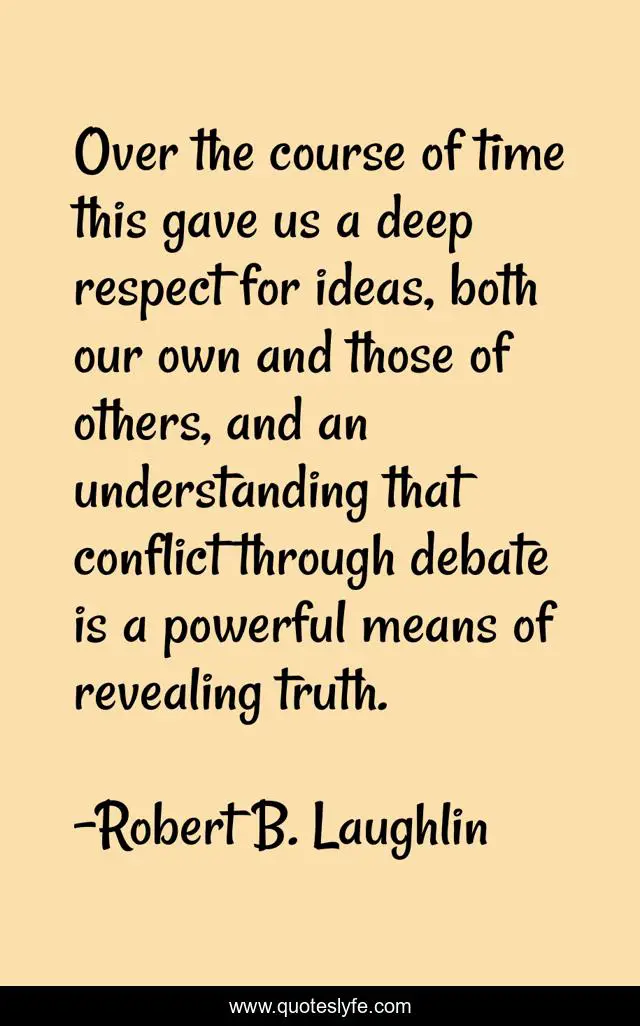 This page presents the quote "Over the course of time this gave us a deep respect for ideas, both our own and those of others, and an understanding that conflict through debate is a powerful means of revealing truth.". Author of this quote is Robert B. Laughlin. This quote is about deep, truth, time,.
