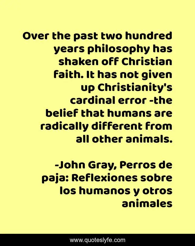 This page presents the quote "Over the past two hundred years philosophy has shaken off Christian faith. It has not given up Christianity's cardinal error -the belief that humans are radically different from all other animals.". Author of this quote is John Gray, Perros de paja: Reflexiones sobre los humanos y otros animales. This quote is about philosophy, christianity,.