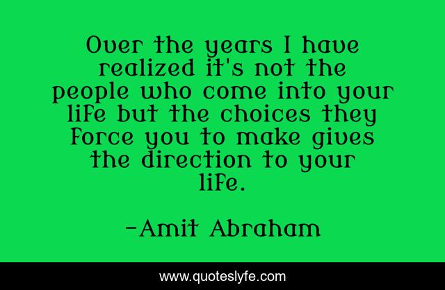 This page presents the quote "Over the years I have realized it's not the people who come into your life but the choices they force you to make gives the direction to your life.". Author of this quote is Amit Abraham. This quote is about choices-and-consequences, life-changing, realization,.