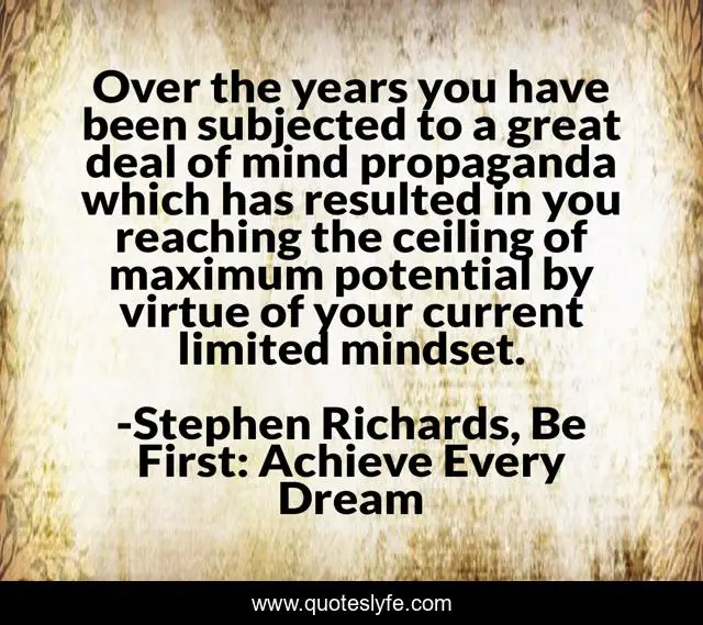 This page presents the quote "Over the years you have been subjected to a great deal of mind propaganda which has resulted in you reaching the ceiling of maximum potential by virtue of your current limited mindset.". Author of this quote is Stephen Richards, Be First: Achieve Every Dream. This quote is about stephen-richards, stephen-richards-author, mind, mindset, self-help,.