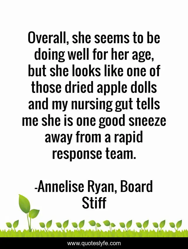 This page presents the quote "Overall, she seems to be doing well for her age, but she looks like one of those dried apple dolls and my nursing gut tells me she is one good sneeze away from a rapid response team.". Author of this quote is Annelise Ryan, Board Stiff. This quote is about age, humurous,.