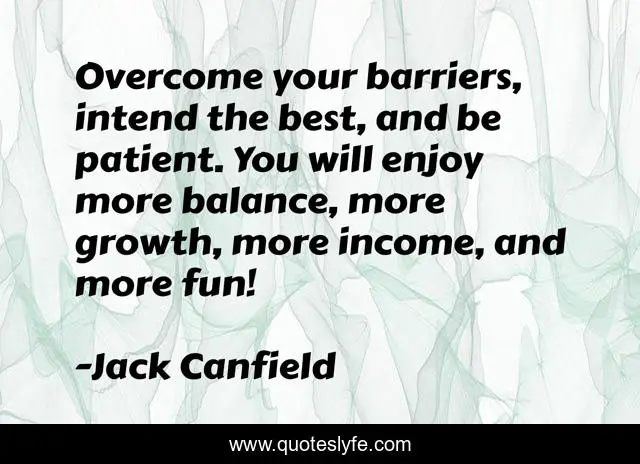 This page presents the quote "Overcome your barriers, intend the best, and be patient. You will enjoy more balance, more growth, more income, and more fun!". Author of this quote is Jack Canfield. This quote is about fun, balance, growth,.