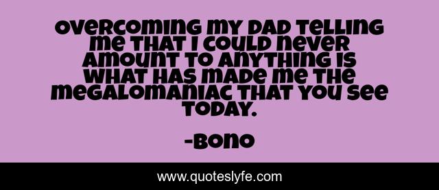 This page presents the quote "Overcoming my dad telling me that I could never amount to anything is what has made me the megalomaniac that you see today.". Author of this quote is Bono. This quote is about me, overcoming, today,.