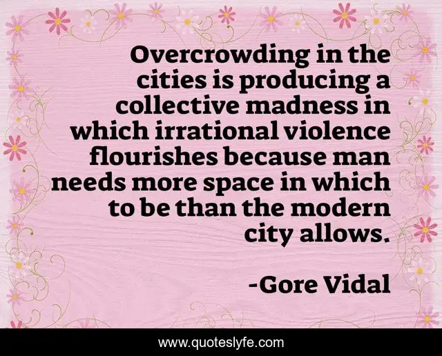 This page presents the quote "Overcrowding in the cities is producing a collective madness in which irrational violence flourishes because man needs more space in which to be than the modern city allows.". Author of this quote is Gore Vidal. This quote is about city, violence, man,.