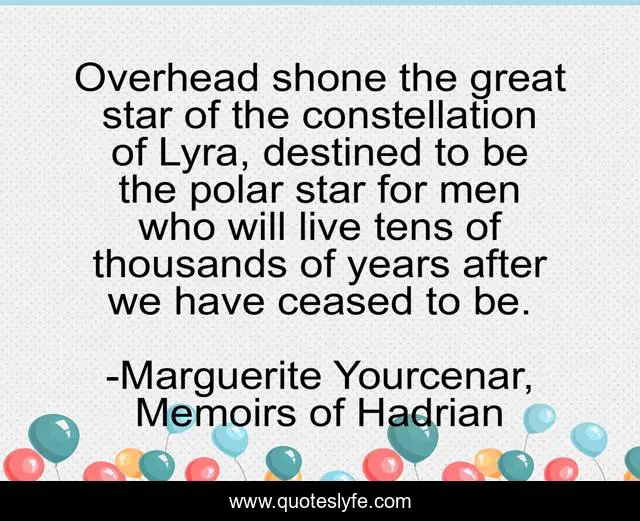 This page presents the quote "Overhead shone the great star of the constellation of Lyra, destined to be the polar star for men who will live tens of thousands of years after we have ceased to be.". Author of this quote is Marguerite Yourcenar, Memoirs of Hadrian. This quote is about life, rome, hadrian, stars,.