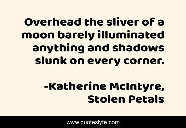 This page presents the quote "Overhead the sliver of a moon barely illuminated anything and shadows slunk on every corner.". Author of this quote is Katherine McIntyre, Stolen Petals. This quote is about moonlight, shadows, stroll, night,.