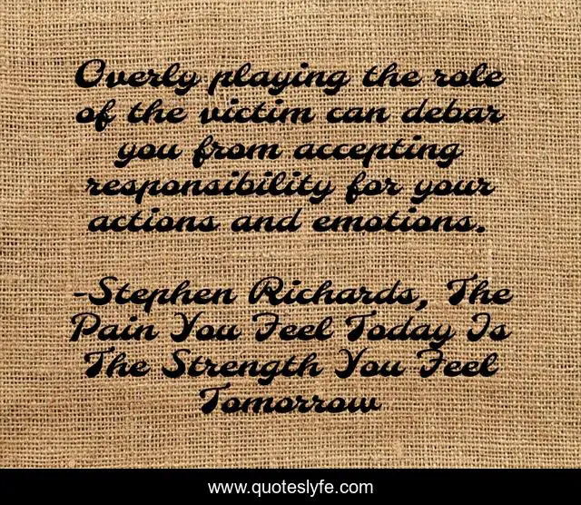 This page presents the quote "Overly playing the role of the victim can debar you from accepting responsibility for your actions and emotions.". Author of this quote is Stephen Richards, The Pain You Feel Today Is The Strength You Feel Tomorrow. This quote is about empowering, confidence, moving-on-and-letting-go, healing-the-past, motivational, forgive, stephen-richards-author, stephen-richards, suffering,.