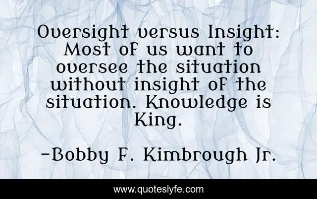 This page presents the quote "Oversight versus Insight: Most of us want to oversee the situation without insight of the situation. Knowledge is King.". Author of this quote is Bobby F. Kimbrough Jr.. This quote is about insight, knowledge, power-of-words,.