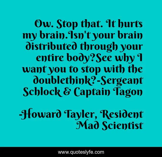 This page presents the quote "Ow. Stop that. It hurts my brain.Isn't your brain distributed through your entire body?See why I want you to stop with the doublethink?-Sergeant Schlock & Captain Tagon". Author of this quote is Howard Tayler, Resident Mad Scientist. This quote is about doublethink, humour, headache,.