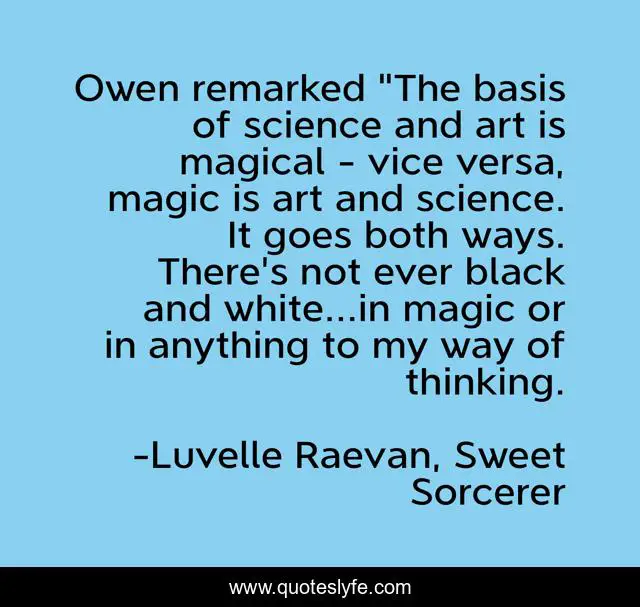 This page presents the quote "Owen remarked "The basis of science and art is magical - vice versa, magic is art and science. It goes both ways. There's not ever black and white...in magic or in anything to my way of thinking.". Author of this quote is Luvelle Raevan, Sweet Sorcerer. This quote is about romance, magic, paranormal,.