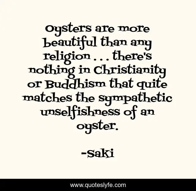 This page presents the quote "Oysters are more beautiful than any religion . . . there's nothing in Christianity or Buddhism that quite matches the sympathetic unselfishness of an oyster.". Author of this quote is Saki. .